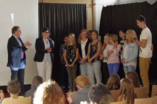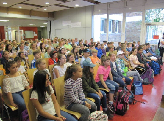 Gleich am zweiten Schultag konnte Herr Schulz die drei neuen 5. Klassen in unserem Forum empfangen. Die Schülerinnen und Schüler der 6. Klassen sorgten mit einem Theater unter der Leitung von Frau Siegert, Frau Erne, Frau Steiner und Frau Drixler dafür, dass der Übergang von der Grundschule in die Sekundarstufe keine allzu große Hürde darstellte :).