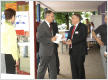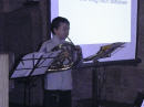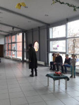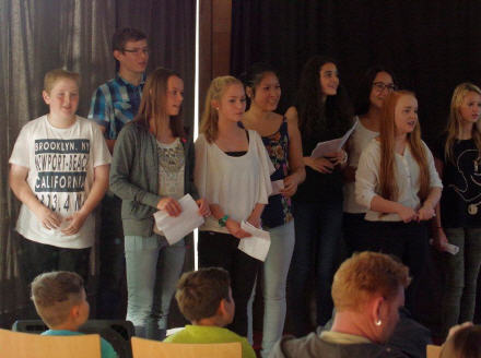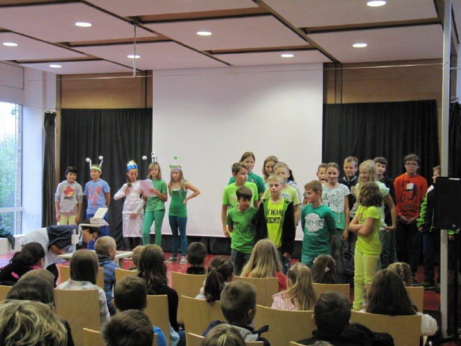Diese vielfältigen Aktionen konnten anschließend bestaunt werden, denn ein abwechslungsreiches Programm wartete auf die kleinen und großen Besucher. Im Forum der Schule führte Schülersprecher Maximilian Awiszus durch das Programm, in dem auf der Show- Bühne einige Schüler ihre Talente präsentierten. Eine Büttenrede von Lars Gerrit Meyer und Simon Ridmann begeisterten ebenso wie die Zauberkunststücke von Jochen Schaufelberger und die musikalische Aufführung von Aytunc Sevinc, Nadja Schwarz und Jana Schmucker. Die Schüler der 4a und der H6 begleiteten musikalisch ihre Lehrerin F. Hofmann bei der Präsentation der Partnerschule aus Kamerun. „Sightseeing with Martians“, so lautete der Titel des englischsprachigen Musicals, das die Schüler der R5a unter der Leitung von F.Hirsch darboten, und natürlich durfte die Schulband nicht fehlen, die unter der Leitung von H.Hammer wahre Begeisterungsstürme auslöste.