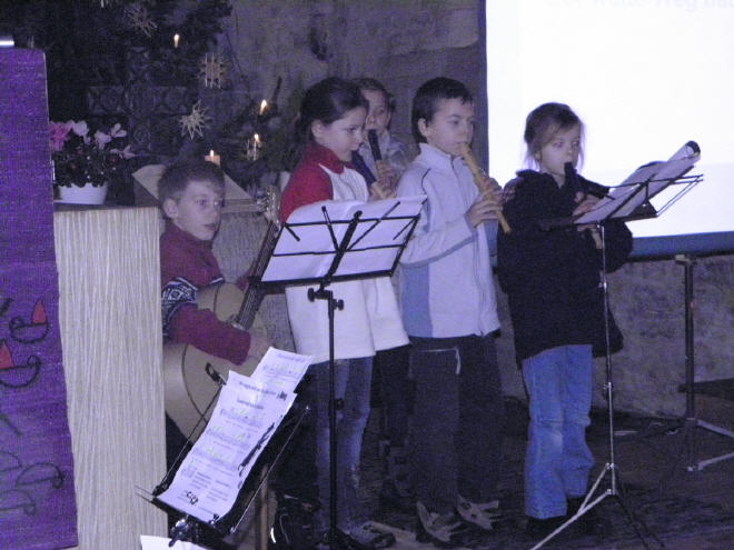 Nun waren die Brenzer Grundschüler an der Reihe. Souverän moderiert von Christoph Häck und Jakob Vorwerk zeigten die Schülerinnen und Schüler, was sie alles zusammen mit ihren Lehrerinnen Silke Essert und Bettina Ilg in den vergangenen Tagen einstudiert hatten. Die Klasse 1c/2c begrüßte alle mit ihrem Morgentanz und einem netten Gedicht. Die Klasse 3c/4c führte nicht nur ein kleines Weihnachtsspiel auf, sondern hatte eigens einen Tanz einstudiert. Nach weiteren Gedichtvorträgen und Musikstücken endete das tolle Programm mit dem gemeinsam gesungenen Weihnachtslied ‚Alle Jahre wieder‘, an der Flöte begleitet von Amelie Holzwarth, Leni Kopp und Lena Mack.