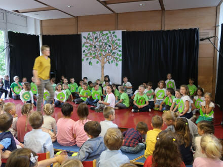 Die Grußworte des Freundeskreises überbrachte Herr Hermann Kleinhans. Die Tanz-AG überraschte die Anwesenden mit einer gelungenen Tanzeinlage. Die Erstklässler präsentierten „Das Schulgespenst“. Ein lustiges und kurzweiliges Theaterstück, das auf großen Anklang stieß. Die Fünftklässler sangen und rappten das Lied „Unsere Schule ist ein Platz zum Leben“.