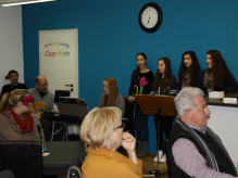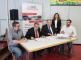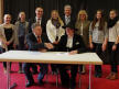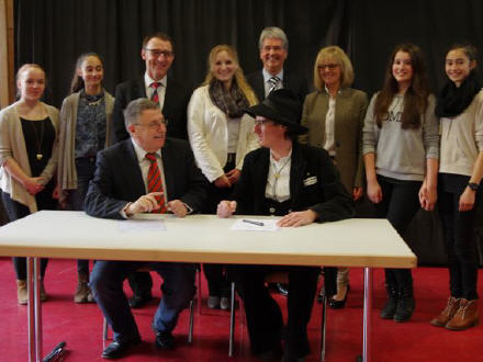 Bildunterschrift: Per Unterschrift und Handschlag besiegelten Rainer Schulz und Peter Renner die Bildungspartnerschaft. Stehend - flankiert von den 4 Sängerinnen der Schulband Ramona Brettschneider, Irem Cin, Magribe Neziri und Ceren Cin: Bürgermeister Matthias Kraut, Katharina Wischenbarth, Emil Kesselburg und Yvonne Renner (von links nach rechts)