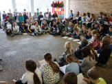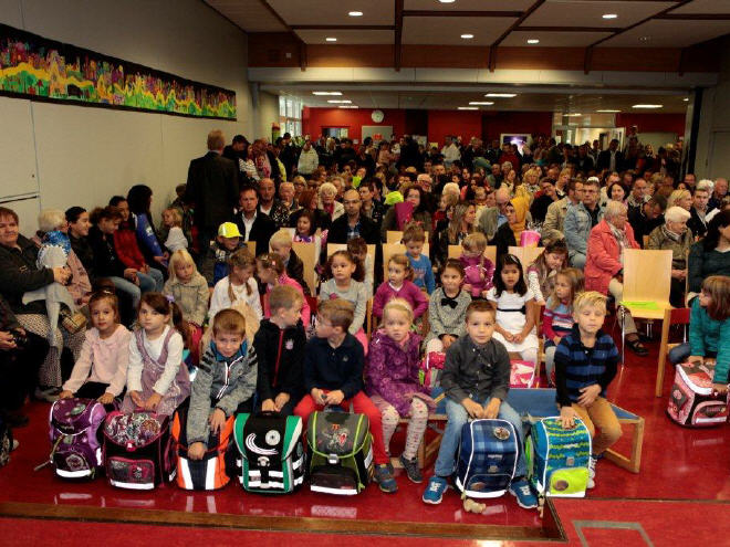 Zu Beginn des Schuljahres wurden unseren neuen Erstklässler erst in der Kirche, dann im Forum von den Zweitklässlern und Rektor Schulz empfangen.