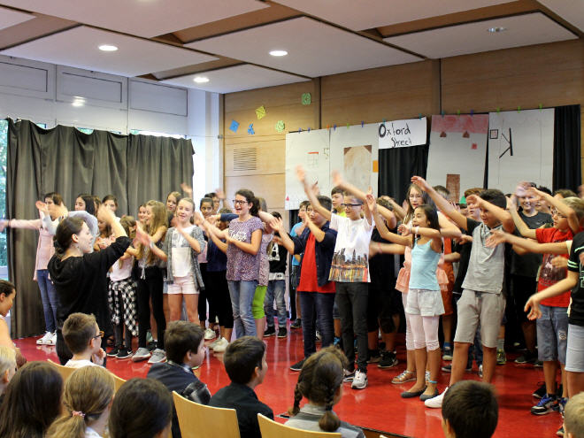 Am ersten Schultag wurden die neuen Fünftklässler der Werkrealschule und der Realschule in unserem Foyer von Rektor Rainer Schulz begrüßt. Die letztjährigen Fünftklässler empfingen ihre neuen Schulkameraden und Schulkameradinnen mit einem Ausschnitt aus einem englischen Musical unter Leitung von Frau Erne.