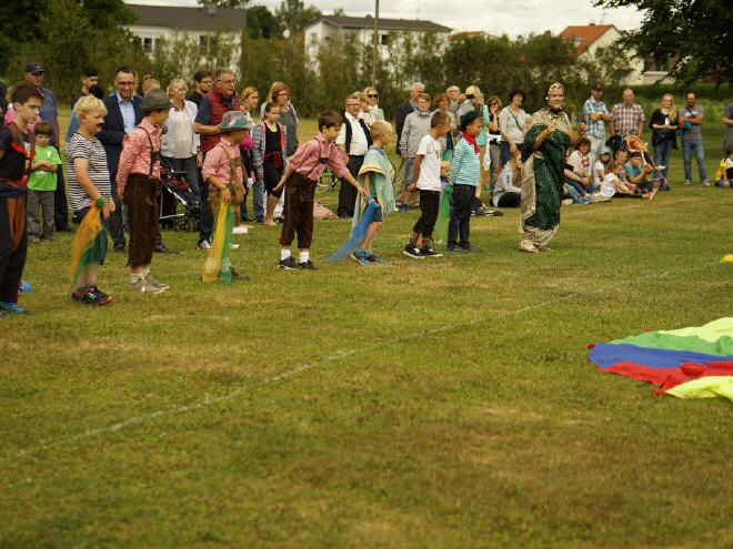 Da war was los! Am Samstag, dem 18.06.16, hieß es beim Sontheimer Kinderfest „Kommt mit ins Märchenland. Mit herrlichen Kostümen versehen, stellten die Grundschüler die unterschiedlichsten Märchen dar. Neben dem Froschkönig, den 7 Schwaben, der goldenen Gans und dem Rattenfänger von Hameln zog auch Schneewittchen mit ihren Zwergen von der Schule zur Sporthalle. Auch die Kindergartenkinder waren mit Begeisterung dabei. Sie begannen auch in der Hermann- Eberhardt- Halle mit ihren Tanzvorführungen. Im Anschluss daran zeigten die Grundschüler, was sie in den letzten Tagen mit ihren Lehrerinnen Anja Österreicher und Leonie Gödrich einstudiert hatten. Ein schönes Fest, das trotz des etwas launischen Wetters, allen viel Freude bereitete.
