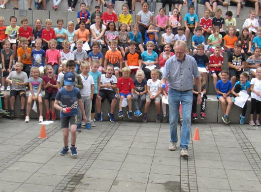 Morgens wurde Herr Braunwarth von seinen Grundschülern beim Wettbewerb "Schlag den Braunwarth" herausgefordert. Selbst eine Verletzung konnte ihn nicht stoppen und er gewann nach aufopferungsvollem Kampf ganz knapp, allerdings schon mit Hilfe einiger "Sozialpunkte". Nach einer kurzen Verschnaufpause trafen sich dann viele Gäste im Forum, um offiziell Herr Braunwarth zu verabschieden. Offizielle Reden, musikalische Einlagen, Theateraufführungen, Ehemalige Kollegen, ehemalige Schüler und Häppchen der Elternschaft ließen den Nachmittag sehr schnell vorbeigehen. Wir wünschen Herr Braunwarth von Herzen einen glücklichen Ruhestand und hoffen, dass wir ihn hin und wieder bei uns antreffen können.