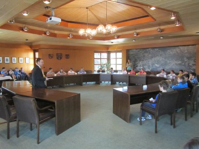 Die 51 Schülerinnen und Schüler wurden gleich zu Beginn von Bürgermeister Kraut herzlich empfangen und in den großen Sitzungssaal der Gemeinde Sontheim gebeten. Eine Gruppe von 22 Schülerinnen und Schülern durfte dort auf den Sitzen der Gemeinderäte Platz nehmen und Herrn Kraut bereits in den Klassen vorbereitete Fragen stellen.