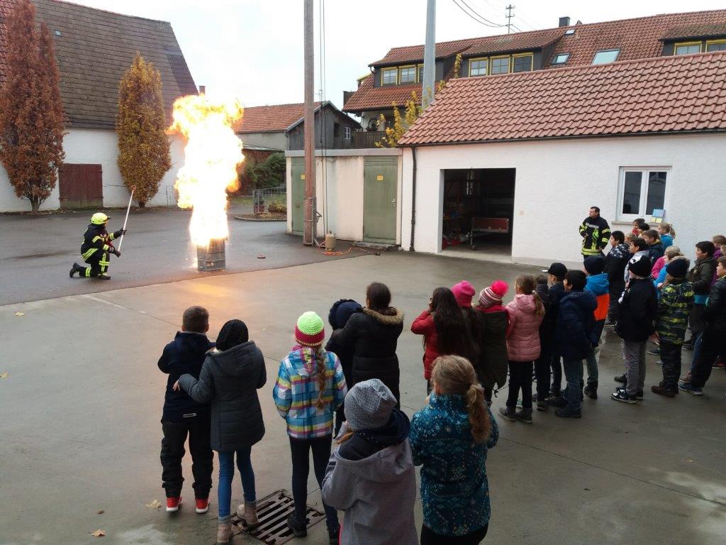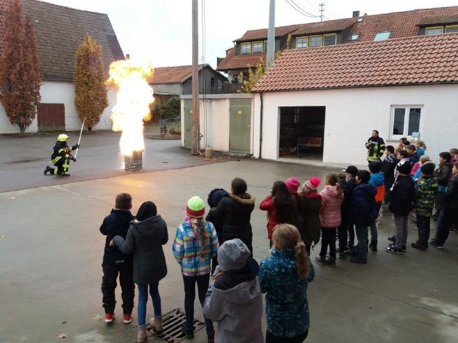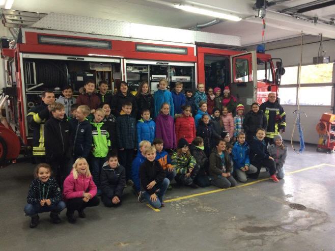 Am 9. November machten sich die beiden vierten Klassen der GWRRS Sontheim mit ihren Klassenlehrerinnen bei nebligem Wetter auf den Weg zur Feuerwehr in Sontheim. Dort erwarteten sie bereits Herr Baranyai und Herr Moser im Schulungsraum. Die beiden Feuerwehrmänner stellten den Schülern die vielfältigen Aufgaben der Feuerwehr vor: löschen, bergen, retten und schützen. Aber auch der „vorbeugende Brandschutz“ wie der Besuch von Schulklassen, Kindergärten und Vereinen, bei dem die Feuerwehr informiert, gehört zum Arbeitsfeld der Freiwilligen Feuerwehr in Sontheim. Bereits ab 12 Jahren können Kinder in die Jugendfeuerwehr eintreten und so ihren Weg bei den Feuerwehrkameraden beginnen, mit 17 Jahren fängt dann die Ausbildung in der „richtigen“ Feuerwehr an, die ungefähr 2 Jahre dauert.