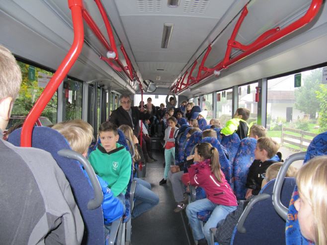 Während die Erstklässler vielfältige Informationen zum sicheren Verhalten an der Bushaltestelle und im Bus bekamen und ihnen anschaulich gezeigt wurde, dass man beim Aussteigen keine Angst haben muss eingeklemmt zu werden, klärte Walter Babel die älteren Schüler zusätzlich über die Sicherheitsvorkehrungen im Bus auf. Bei einer Probefahrt wurde abschließend eindrucksvoll demonstriert, welche Auswirkungen ein plötzlicher Bremsvorgang in einem besetzten Bus haben kann. Eine blaue Tonne, die als Dummy diente und mitten im Gang stand, wurde beim Bremsen durch den Bus geschleudert und knallte an die Haltestangen.