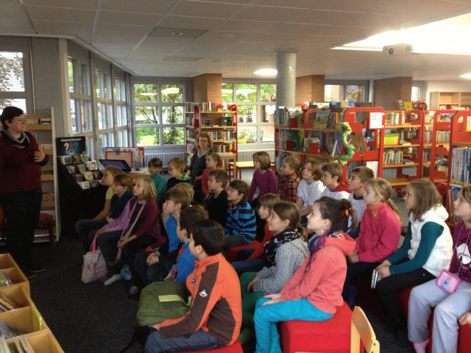 Letzte Woche, am 10. Oktober waren wir in der Ortsbücherei in Sontheim. Frau Thumm erwartete uns dort schon. Sie las uns eine Geschichte vor und zeigte uns die Bilder dazu mit einem Beamer. Danach gab sie uns allen eine Aufgabe. Frau Thumm legte auf einen Tisch verschiedene „erste Sätze“ aus Büchern. Jede Gruppe suchte sich einen „ersten Satz“ heraus und schrieb eine eigene Geschichte dazu. Später durften wir sie vorlesen. Es kamen sehr lustige und tolle Aufsätzchen heraus. Als Frau Thumm uns die passenden Bücher zu den Satzanfängen zeigte, waren wir sehr überrascht, was das wirklich für Bücher waren. Zum Schluss durften wir noch Bücher anschauen und ausleihen. Dann liefen wir zurück zur Schule.