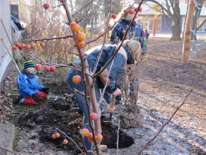 Bei strahlendem Sonnenschein, aber eisigen Temperaturen, waren am vergangenen Mittwoch die Schülerinnen und Schüler der ‚Spaß in der Natur‘ AG mit ihren Jugendbegleiterinnen Birgit Romes, Christiane Woisetschläger und Hadwig Franz auf dem Pausenhof der Sontheimer Schule bei der Arbeit zu beobachten. Nachdem im Frühjahr die neuen Spielgeräte ihrer Bestimmung übergeben worden sind, wurden nun die verschiedensten Sträucher und Bäume am südlichen Rand der Bewegungslandschaft eingepflanzt. Dank der Unterstützung durch den Leiter des örtlichen Bauhofes Herrn Stütz, der für eine geeignete Auswahl der Sträucher sorgte, und durch den Hausmeister Herrn Hörger, hoffen alle, dass die Pflanzen gut anwachsen und im Frühjahr die ersten Blüten zu sehen sind.