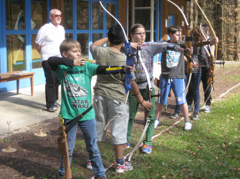 Dass Schule auch Spaß machen kann, das erfahren einmal mehr zurzeit 7 Schülerinnen und Schüler der Grund-, Werkreal- und Realschule Sontheim. Unter der Leitung von Herrn Weng und Herrn Fischer vom Zimmerstutzenverein Sontheim und unterstützt von den Schülermentoren Viveca Niekrenz und Moritz Görsdorf lernen Sarah Brauner, Lara Grandel, Madeleine Wiedenmann, Leon Bronnhuber, Andreas Baß, Nguyen Nam Jasper und Fabian Linkh die Grundlagen des Bogenschießens kennen. Sie erfahren an 6 Nachmittagen, wie ein Bogen aufgebaut ist, wie der Bogen eingestellt werden muss, wie die Pfeile richtig ‚gezogen‘ werden müssen und wie richtig gezielt wird. Auch ein passendes Aufwärmprogramm wird den Schülern von ihren Betreuern vermittelt. Bogenschießen ist eines der Ganztagesangebote, das von Jugendbegleitern und Schülermentoren im Rahmen der Offenen Ganztagesschule geleitet wird.