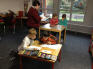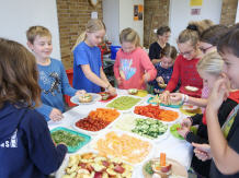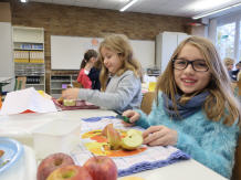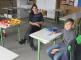 In einer wurden Obst und Gemüse geschnitten, nachdem Hygieneregeln und Schneidetechniken besprochen wurden. Auf Vollkornbrötchen mit Frischkäse durfte jeder damit ein lustiges Gesicht gestalten. In der anschließenden Theoriephase wurden alle wichtigen Bestandteile eines gesunden Frühstücks angesprochen und erörtert welche Aufgaben und Funktionen Getreide, Wasser, Obst, Gemüse und der Milchbaustein haben.