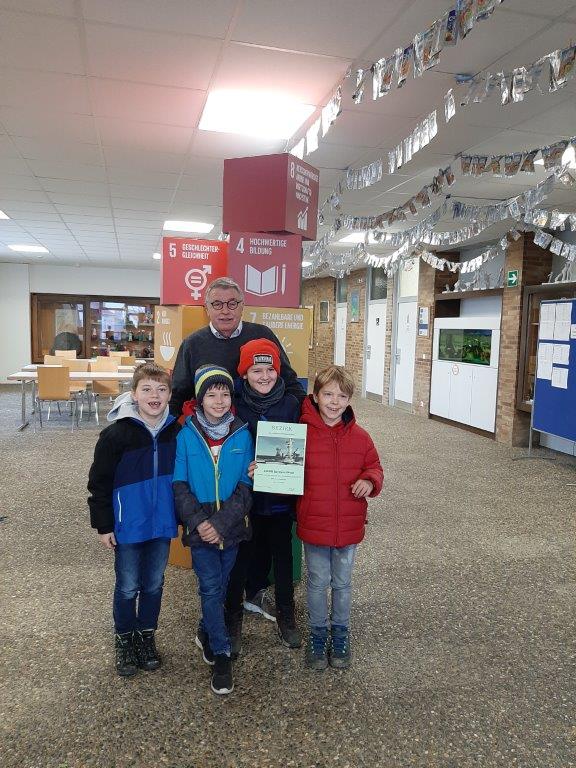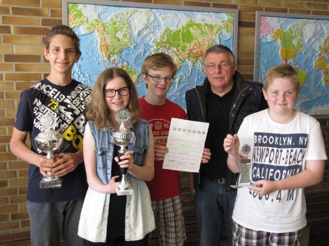 Das Bild zeigt von links Jakob Maier, Eric Horsch, Herr Schulz, Torben Horsch und Kaya Kaplan
