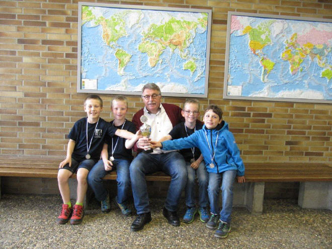 Erstmalig überhaupt reiste eine Schülerschachmannschaft der Grundschule Sontheim zum Täferrot-Open nahe Schwäbisch Gmünd. Natürlich waren die Jungs um ihren Betreuer Sören Pürckhauer anfänglich leicht nervös. Aber bereits in der ersten Runde legten Jakob Maier, Torben und Eric Horsch sowie Kaya Kaplan ihre Nervosität ab und konzentrierten sich auf ihre Partien. So stand man mit zwei 4:0-Siegen nach zwei Runden ganz vorne und musste somit gegen den Gastgeber und Turnierfavoriten, die Grundschule Täferrot antreten. Sicherlich ließ man hier und dort eine Chance aus, aber die Täferroter spielten auch gekonnt und routiniert ihre Partien und man verlor verdient mit 0,5:3,5. Nach dem anschließenden 3:1-Sieg in der 4.Runde, durfte man dann auch gleich gegen den zweiten Favoriten und späteren Sieger, die Rauchbeinschule Schwäbisch Gmünd ran. Hier konnte lediglich Kaya Kaplan für den „Ehrentreffer“ sorgen, so dass letztlich eine 1:3-Niederlage zu Buche stand. Mit zwei furiosen Kantersiegen in den letzten beiden Runden, schafften die Jungs aber doch noch die nicht geglaubte Überraschung und man landete auf dem 3. Platz, für welchen es auch noch den erträumten Pokal gab. Es spielten an Brett 1 Jakob Maier (4,5 Punkte/ 7 Partien), Brett 2 Torben Horsch (5,5/7), Brett 3 Eric Horsch (4/7) und an Brett 4 Kaya Kaplan (6/7). Voller Stolz brachten die Vier am Folgetag ihren Pokal zu ihrem Schulleiter Herr Schulz, der den sensationellen Erfolg fast nicht glauben konnte – Herzlichen Glückwunsch!
